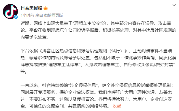 8月12日,抖音发布公告称,近期网络上出现大量关于“理想车主”的讨论,其中部分内容存在误导、攻击言论,平台在收到理想汽车公司投诉举报后,积极核实处理,对其中违反社区规则的内容予以处置。